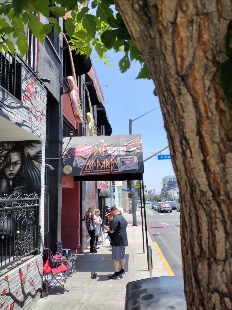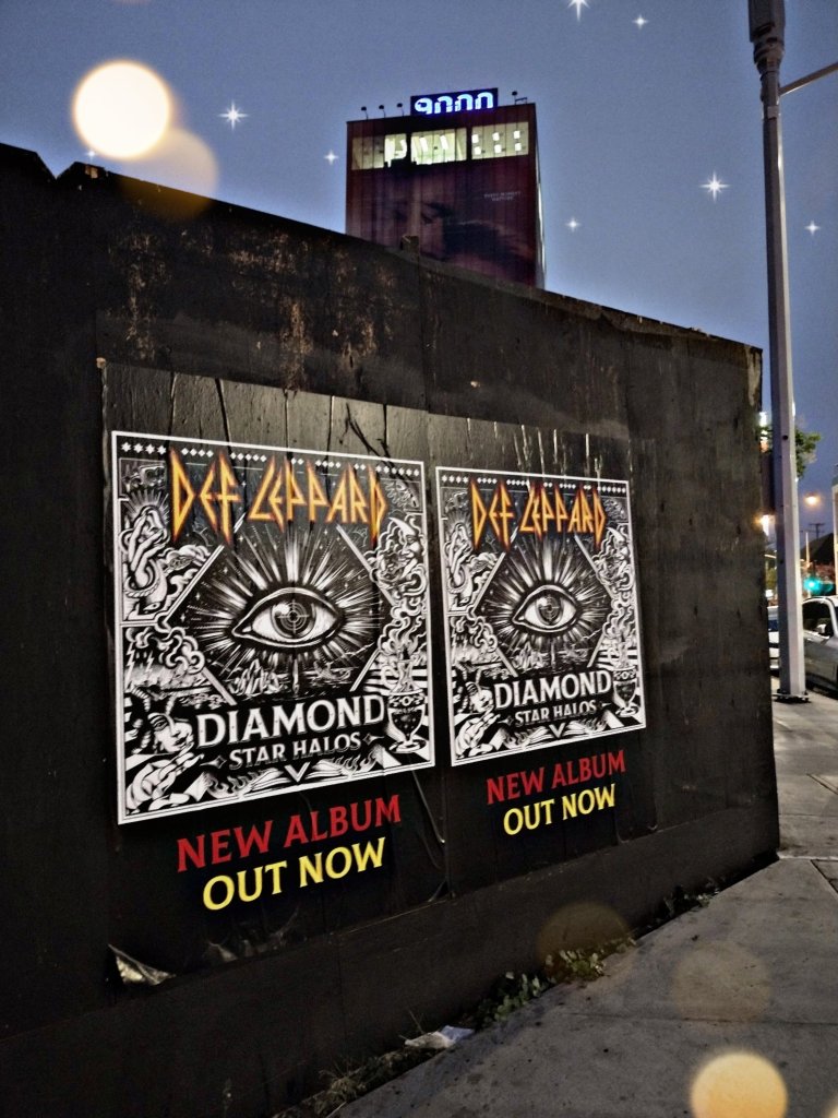 L.A. is always gets a little more exciting when Def Leppard’s in town. And it’s good to see some authentic rock and roll nostalgia back on the boulevard courtesy of huge promo posters for Diamond Star Halos that have added a splash of rock n’ roll flair in two different locations on Rock Row, appropriately between the Rainbow and Whisky.