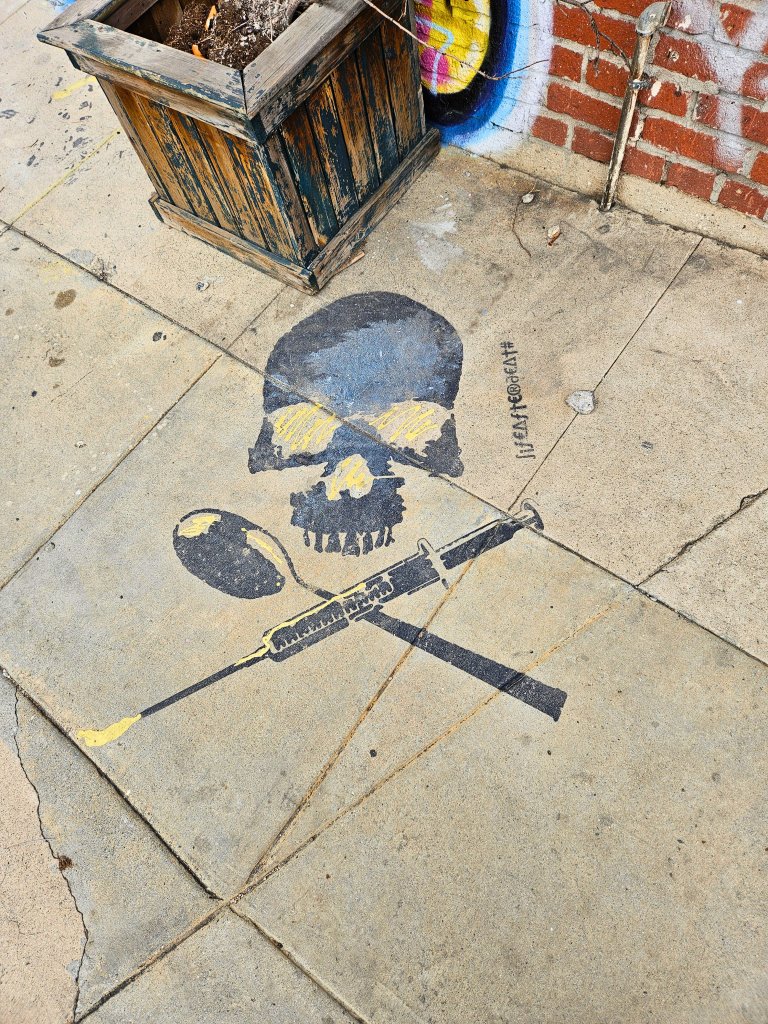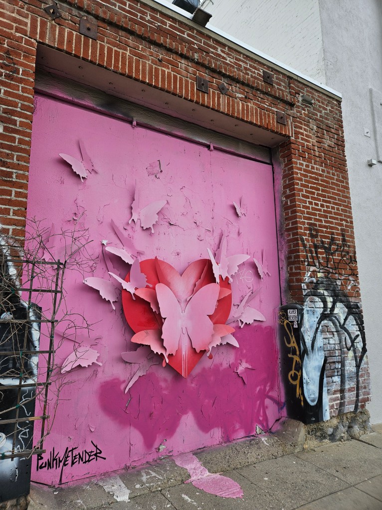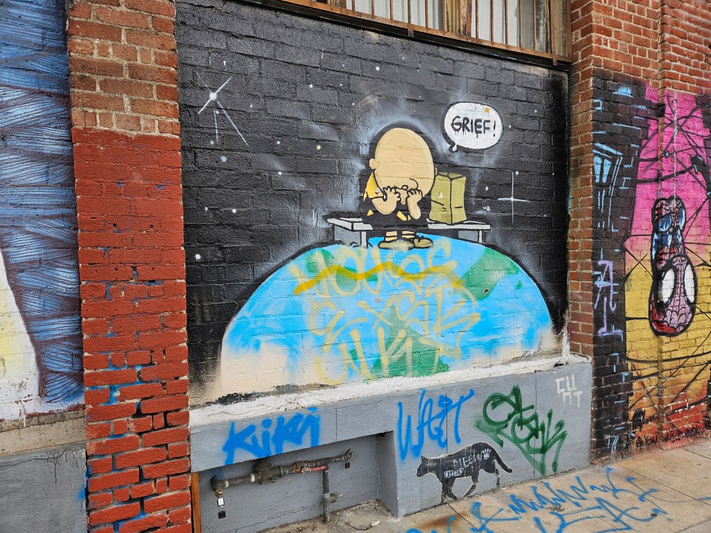 The urban art gallery then shifts style to include a random anti-drug statement on the pavement that features an ominous skull and drug paraphernalia, which is juxtaposed with a hopeful tribute to love and lovers everywhere, represented by a soft-pink 3-D mural of hearts. Perhaps it’s a reminder that when faced with any setback, like the one that has Charlie Brown looking like he just lost his best friend, to get through, all you need is love.