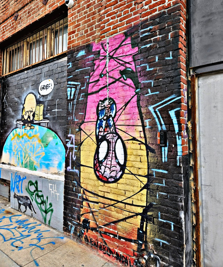 The urban art gallery then shifts style to include a random anti-drug statement on the pavement that features an ominous skull and drug paraphernalia, which is juxtaposed with a hopeful tribute to love and lovers everywhere, represented by a soft-pink 3-D mural of hearts. Perhaps it’s a reminder that when faced with any setback, like the one that has Charlie Brown looking like he just lost his best friend, to get through, all you need is love.