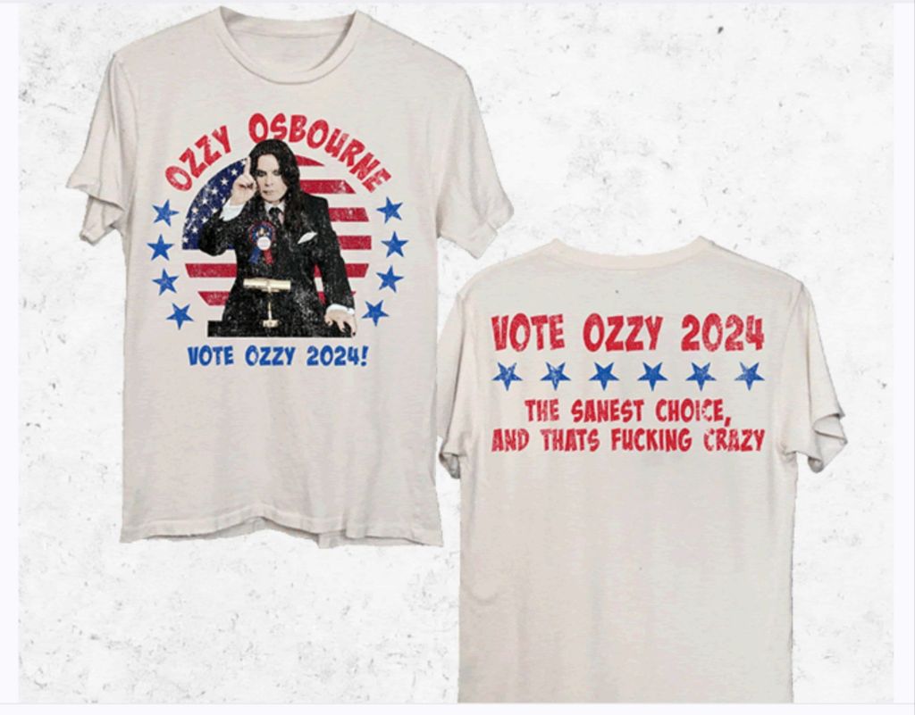 Ozzy’s giving us the campaign we didn’t know we needed with his new “Ozzy for President 2024” t-shirt. It’s not just a shirt—it’s a statement. Featuring Ozzy’s unmistakable mug and the slogan “Vote for Ozzy President 2024,” it’s the ultimate nod to the chaos that has become the political landscape. And on the back of the tee, Ozzy declares himself “the sanest choice—and that’s crazy.”
