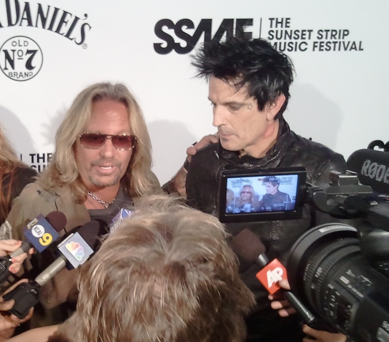 Motley Crue’s Vince Neil and Tommy Lee face the cameras at the Sunset Strip’s House of Blues last year.