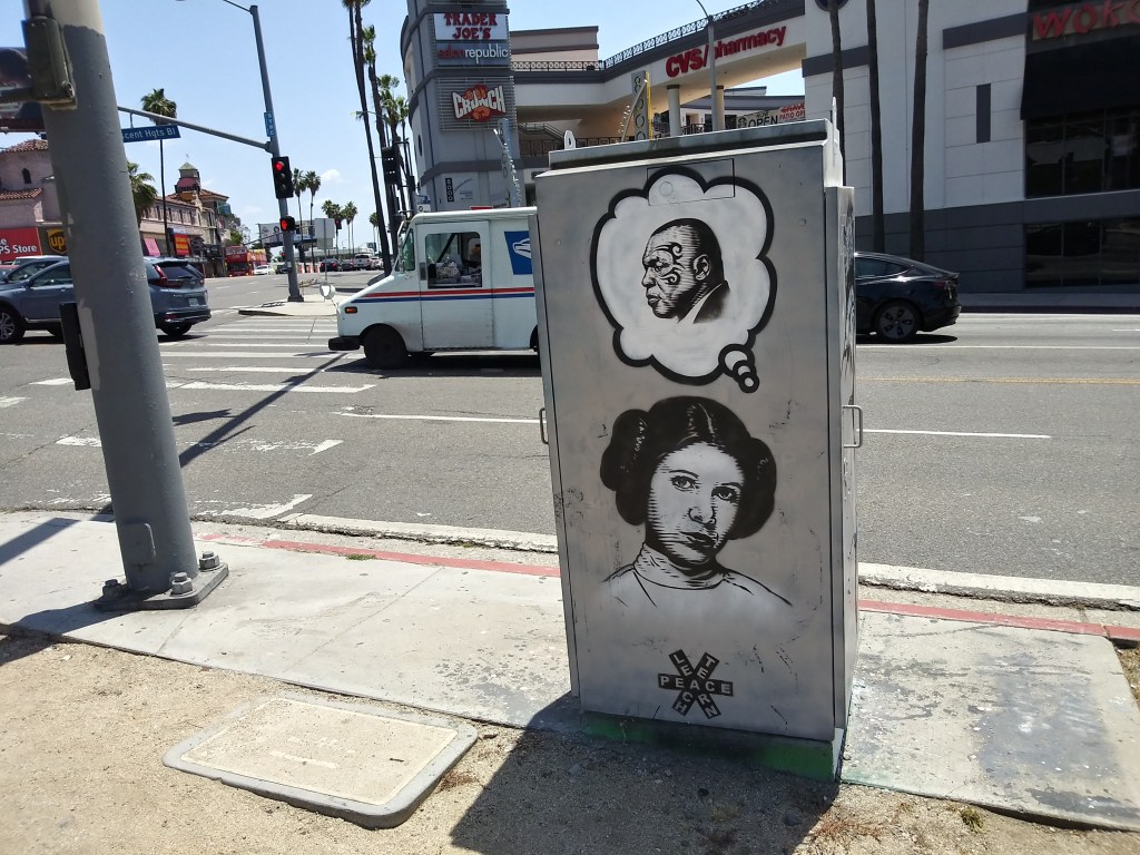 Take a turn down an alley just south of Santa Monica Boulevard and off Sycamore, and suddenly you’re face to face with a pair of familiar eyes that stop you in your tracks. Piercing, soulful, surreal. It’s the immortal King of Pop, Michael Jackson, or at least the memory of him, rendered in rich colors, framed by waves of soft pastel lines that ripple across his face like soundwaves from a song you can almost hear. His expression is both ethereal and human, as if watching over the sacred Hollywood streets he once danced across in music videos. MJ isn’t just remembered here. He’s revered in a saintly glow.