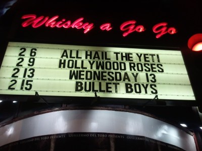 We were walking down Sunset this evening sulking from neglecting to get tickets to see metal gods Metallica play L.A. in May when we spotted the Whisky‘s marquee and two words made us feel better right away: Hollywood Roses, the best GN’R tribute band around will be rocking the Whisky ion February 9.